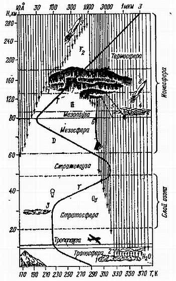Рассмотрим теперь строение атмосферы с несколько иной точки зрения, а именно с точки зрения ее взаимодействия с солнечными лучами. Хотя об этом уже не раз говорилось, мы совершим здесь как бы путешествие вместе с солнечным лучом в направлении сверху вниз. Это позволит привести все сказанное о взаимодействии излучения Солнца с атомами и молекулами атмосферы в стройную систему.