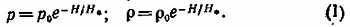 Здесь р0, ρ0 — давление и плотность на уровне моря, Н — высота, отсчитываемая от этого уровня, Н* — очень важная величина, называемая шкалой высот, или высотой однородной атмосферы. Она определяет интервал высот, на котором плотность и давление уменьшаются в е раз (е = 2,718…— основание натуральных логарифмов). Как показывает теория, величина Н* определяется формулой