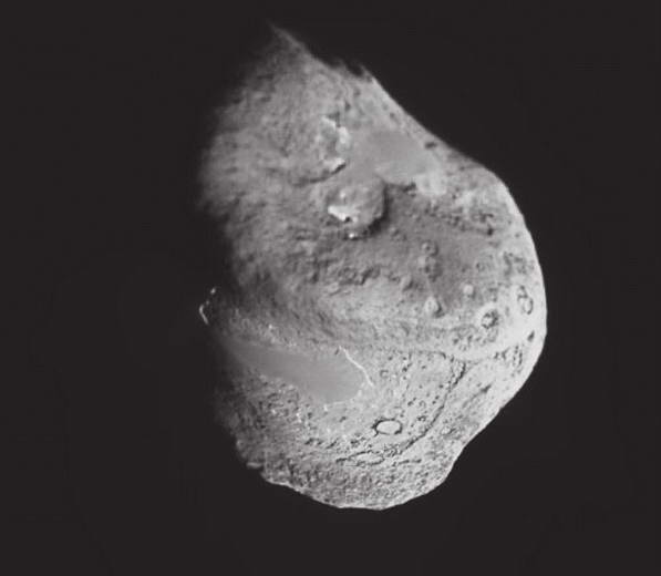 Ещё изучение колебаний блеска Эроса, выполненное с Земли, показало, что астероид имеет форму груши размером 38x1 6 км, а его период вращения 5 час 16 мин. При первом сближении были получены многочисленные снимки Эроса. Период вращения в точности подтвердился, а размеры уточнились лишь немного: 40x14 км. Это ли не свидетельство надежности наземных астрономических исследований!