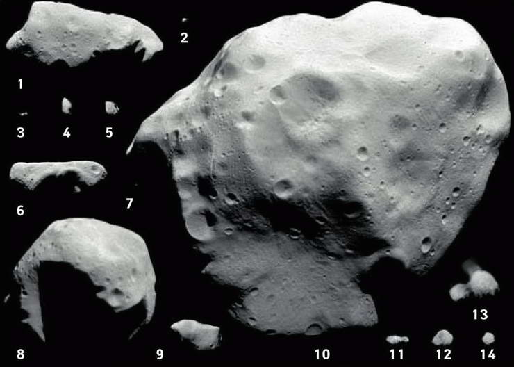 1. Ида; 2. Дактиль; 3. Брайль; 4. Аннафранк; 5. Стеинс; 6. Эрос; 7. Итакава; 8. Матильда; 9. Гаспра; 10. Лютеция; 11. Борели; 12. Темпль; 13. Галлея; 14. Вильд