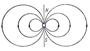 Для подтверждения этой мысли Гильберт намагнитил железный шар и показал, что на маленькую магнитную стрелку он действует подобно Земле. Теперь физики называют такие лабораторные установки, моделирующие Землю с ее магнитным полем и окружающую часть ближнего космоса, "терреллами": в переводе с итальянского "террелла" значит "маленькая Земля", "Земелька". Магнитное поле однородно намагниченного шара, изображавшего в опытах Гильберта Землю, имеет характерный вид (рис. 1): каждая силовая линия — это дуга, которая выходит из поверхности шара в Южном полушарии, проходит над экватором и снова входит в шар, но уже в Северном полушарии. Над двумя точками поверхности шара силовые линии поднимаются вертикально (перпендикулярно поверхности, по радиусу) — это точки магнитных полюсов. Чтобы каждый раз не возвращаться к описанию такого магнитного поля, нам придется запомнить его название-термин: дипольное поле.