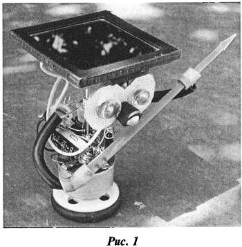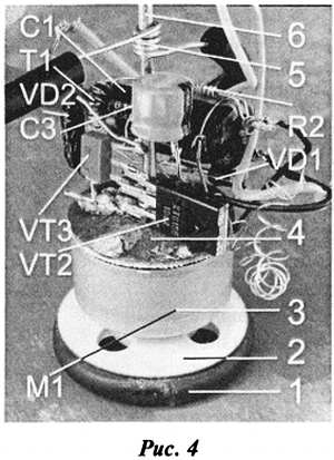 Конструктивно игрушка выполнена в «вертикальном наращивании». Элементы схемы смонтированы объёмно-навесным способом монтажа. Рисунок 4 поясняет её исполнение. На вал двигателя 3 надевают пластмассовый круг-основание 2. Снизу к поверхности основания приклеено резиновое кольцо 1. К контактным лепесткам мотора через сквозные отверстия припаяна плата 4, изготовленная из односторонне фольгированного гетинакса, её диаметр 25 мм. К плате, в свою очередь, припаяна стойка 6 для крепления солнечной батареи. На неё предварительно натянута переходная муфта 5. Муфта скручена на оправке (велосипедной спице) из проволоки канцелярских скрепок. К концам муфты на заключительном этапе сборки припаивают руки стража. Таким образом, получается шарнирное соединение рук.