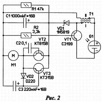 Схема управления двигателем M1 представлена на рис. 2. Трансформатор Т1 и транзистор VT1 образуют блокинг-генератор. После помещения конструкции под яркие солнечные лучи в моменты времени, когда транзистор закрыт, импульсы тока индуцированного суммарного напряжения обмоток трансформатора через развязывающий диод VD1 заряжают конденсатор С1. Резистор R2 ограничивает импульсы тока, управляющие работой транзистора. С течением времени напряжение на конденсаторе растёт. При его значении около 11 В происходит лавинообразное открывание транзистора VT2. Через развязывающий диод VD2 заряжается конденсатор С3. Статор мотора М1 начинает вращаться. При снижении напряжения конденсатора С1 до 8–9 В транзистор закрывается, однако открывается транзистор VT3.
