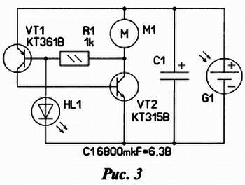 Таким образом, схема представляет собой так называемый солнечный двигатель. Его отличие от «классического двигателя Марка Тилдена» по схеме (рис. 3) — в наличии повышающего преобразователя напряжения и иного «спускового механизма» (транзисторы VT2,VT3). За счёт зарядки накопительного конденсатора до напряжения 11В энергия разряда существенно увеличивается, что повышает «тяговые возможности двигателя».