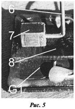 Солнечная батарея вырезается из газонного светильника. Чтобы не повредить рабочий слой солнечной батареи (рис. 5), удобнее при приклеивании бруска 7 предварительно закрепить на обратной стороне элемента пластмассовую планку-переходник 8, используя для крепления боковые пластмассовые бортики лицевой панели светильника. Клей лучше использовать вязкий. Стержень Г-образной стойки 6 должен входить в сквозное отверстие бруска 7 с небольшим усилием. Такая конструкция позволит регулировать угол наклона батареи G1 на солнце. Утром, когда света ещё мало, страж сможет отворачиваться даже при слабой освещённости. А для того, чтобы обеспечить стабильное вращение игрушки, можно воспользоваться зеркальцем. Солнечный зайчик, играющий на панели батареи, заставит её работать на заряд конденсатора.