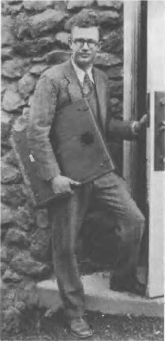 Рис. 1.16. Клайд Томбо у входа в башню 13–дюймового астрографа, с помощью которого был открыт Плутон. В руке у него деревянная кассета с фотопластинкой для этого телескопа.