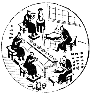 Живописцы сидели рядами на скамейках. Около них стояли чашки с красками и кисточками. Первый брал вазу, рисовал узор вокруг горлышка и передавал другому, тот рисовал горы, третий — людей, четвертый — цветы, пятый расцвечивал рисунок золотом.