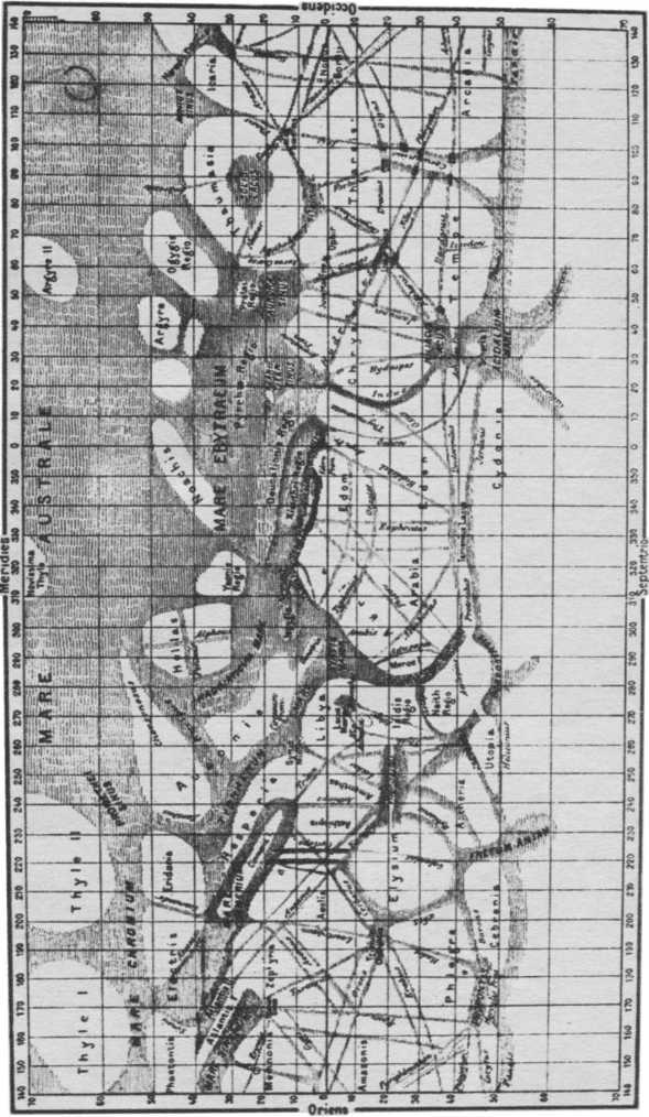 К 1888 году Скиапарелли нанес на карту Марса сто тринадцать каналов. Каждому из них он дал наименование, почерпнутое им из мифологии или представляющее собой просто название некоторых земных рек. Так появились на картах Марса каналы Цербер, Циклоп, Нил, Ганг и другие.