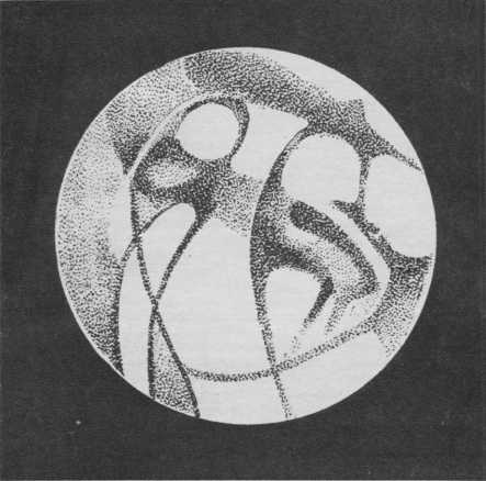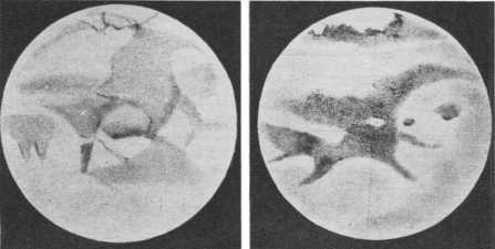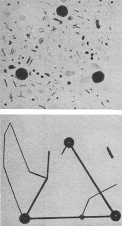 Была выдвинута идея, что марсианские каналы — это иллюзия, обман зрения. Просто человеческий глаз объединяет в прямые линии множество пятен и полосок, имеющихся на поверхности Марса. В доказательство этого проводили опыты с детьми, которые, ничего не зная о спорах астрономов, срисовывали каналы с тех рисунков Марса, где вместо прямолинейных полосок было нанесено много отдельных пятнышек, хаотично разбросанных и имеющих неправильную форму. Посмотрите на рисунок — группа беспорядочно расположенных пятнышек неправильной формы с большого расстояния кажется образующей прямолинейные каналы (верхняя часть рисунка на стр. 82).