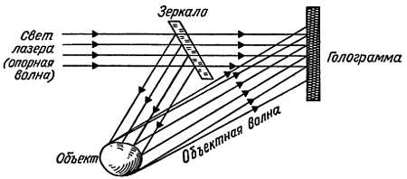 Чтобы получить голограмму, необходимо иметь две интерферирующие монохроматические когерентные световые волны. Одна волна обычно исходит от объекта и падает на фотопластинку (объектная волна). Другая волна носит название опорной (рис. 49). Таким образом, в голографии, как и при фотографировании, решается вопрос о записи информации, которую несет световая волна, отраженная от объекта.