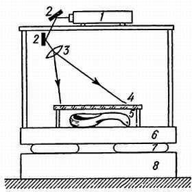 Обычно схему собирают на каменных или металлических плитах 6 с пневматическими амортизаторами 7 и на массивном основании 8 (для создания нечувствительности к вибрациям, оказывающим в этой схеме губительное действие на качество голограммы).