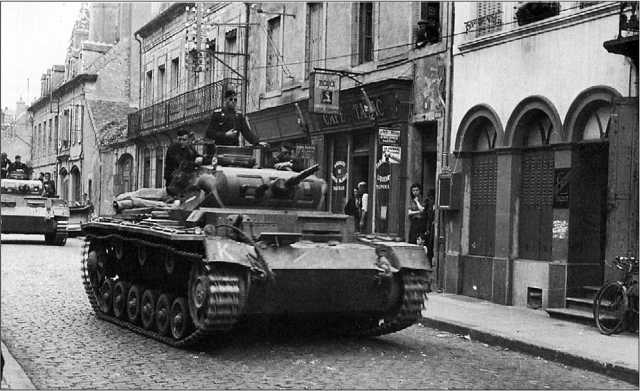 Танки Pz.III Ausf.F на улицах французских городов. На нижнем снимке — танк из состава 7-го танкового полка 10-й танковой дивизии. Май 1940 года.