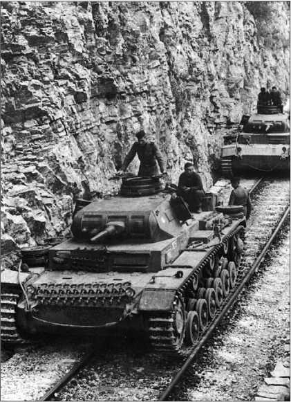 Колонна танков Pz.III Ausf.E 2-й танковой дивизии движется по железнодорожным путям в горной местности. Греция, май 1941 года.