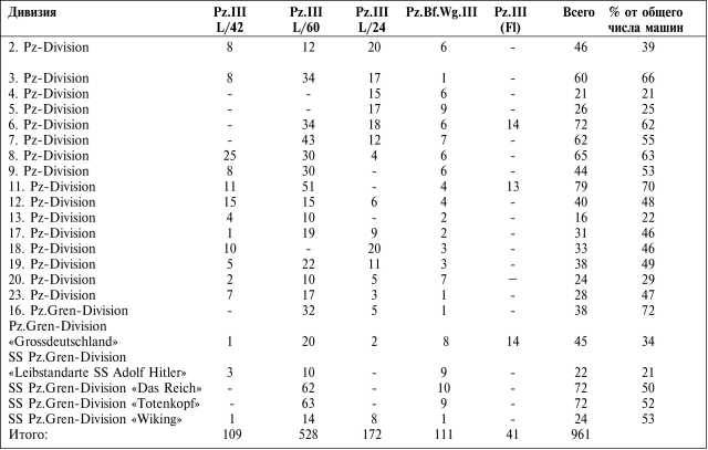 Из этого количества непосредственно для вторжения в Советский Союз предназначалось 965 танков Pz.III, которые были распределены более или менее равномерно по 16 немецким танковым дивизиям из 19, участвовавших в операции «Барбаросса» (6, 7 и 8-я танковые дивизии имели на вооружении танки чехословацкого производства). Так, например, в 1-й танковой дивизии имелось 73 Pz.III и 5 командирских Pz.Bf.Wg.III, в 4-й танковой — 105 боевых машин этого типа. Причем абсолютное большинство танков было вооружено 50-мм пушками L/42.