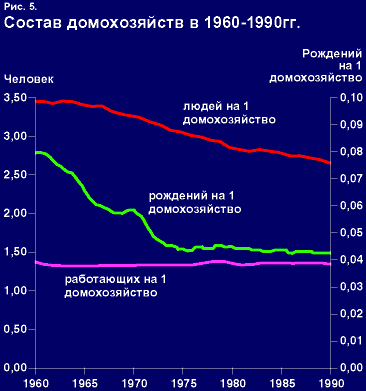 Другая форма «обдирания активов» — это неоправданное снижение уровня рождаемости. Способность поддерживать экономику в целом на достигнутом уровне требует прежних или возрастающих темпов воспроизводства численности рабочей силы в том же или возрастающем количестве, благодаря выживанию молодежи, обладающей соответствующим интеллектуальным развитием и здоровьем. Например, приостанавливая полностью или почти полностью рождаемость, можно было бы снизить уровень дохода на душу населения и уменьшить число ртов, нуждающихся в надлежащем питании, чтобы временно достичь недостижимого иными способами наполнения рыночной корзины, используемой людьми, выжившими в условиях этого спиралевидного коллапсирования численности населения. Представители рабочей силы из домохозяйств, где нет на содержании детей, дешевле для найма, потому что они имеют меньше ртов, которые надо кормить в расчете на одного работающего (См. Рис. 5).