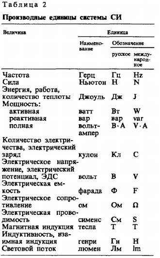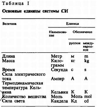 Система СИ строится на основных и производных единицах, названия и обозначения которых приведены в табл. 1 и 2. В ней семь основных единиц: метр — единица длины, килограмм — единица массы (вместо «веса»), секунда — единица времени, ампер — единица силы тока, кельвин — единица температуры, моль — единица количества вещества и кандела — единица силы света. Кроме того, имеются две дополнительные единицы измерения — радиан и стерадин.