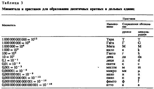 Чтобы упростить написание и чтение численных величин, значение которых во много раз больше или меньше основной или производной единицы, введены десятичные кратные и дольные (дробные) приставки, характеристики которых приведены в табл. 3. Система СИ включает шесть кратных (дека, гекто, кило, Мега, Гига, Тера) и восемь дольных (деци, санти, милли, микро, нано, пико, фемто, атто) приставок. Некоторые из них, например кило; милли, микро, давно известны и широко используются на практике. Другие, например нано, Тера, используются сравнительно редко. Приставки гекто, дека, деци и санти применяют только в наименованиях кратных и дольных единиц, давно получивших распространение, например гектар, декаметр, сантиметр.