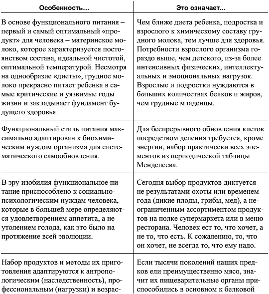 Функциональное питание, в отличие от иррационального, – это стиль питания «для того, чтобы жить», адаптированный к современным возможностям, условиям и привычкам. Оно, с одной стороны, целенаправленно воспроизводит «счастливое стечение обстоятельств», с которыми повезло нашим предкам, с другой – учитывает пол, возраст и интенсивность профессиональных нагрузок, современную технологию выращивания и приготовления продуктов и, наконец, в сочетании с пищевыми добавками компенсирует недостаток питательных элементов, необходимых для абсолютного здоровья и долголетия.