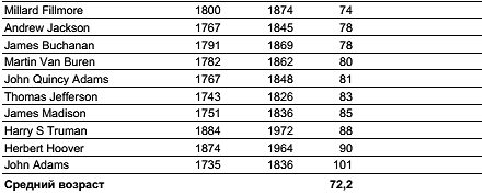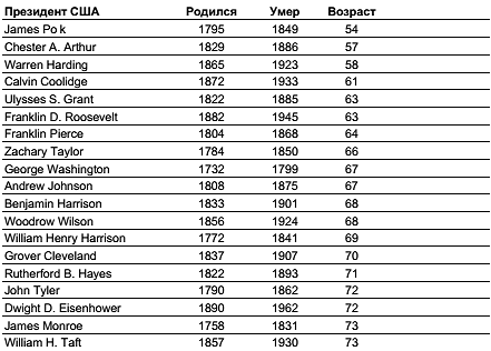 Как видите, средняя продолжительность жизни президентов США, родившихся до XX века (за исключением убитых Линкольна, Гарфилда, Маккинли и Теодора Рузвельта), составляла 72,2 года. John Adams (1735–1836) дожил до 101 года, James Polk (1795–1849) умер самым молодым – в 54 года. Возможно, многие из них прожили бы на 10–15 лет дольше, как большинство мужчин и женщин их социального класса, если бы не специфика их президентской деятельности – общение с большим количеством людей, чрезмерные умственные и физические нагрузки, ежедневный стресс, утомительные поездки по стране и другие факторы риска.