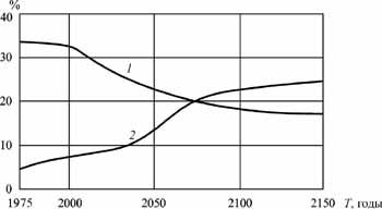 Если начало перехода сопровождается быстрым ростом и исторически внезапным появлением молодого поколения, то в конце перехода происходит старение населения. Это приведет к глубоким изменениям семьи и отношением поколений, системы образования и социального страхования, всей системы ценностей, управляющих обществом предвидимого будущего. Изменение возрастного состава общества (рис. 7.4) и установленями новых соотношений между старшим и молодым поколением представляется основным результатом и наступает при завершении демографического перехода. Так предстоящая стабилизация населения мира знаменует переход к новому состоянию человечества, которое можно назвать асимптотическим.