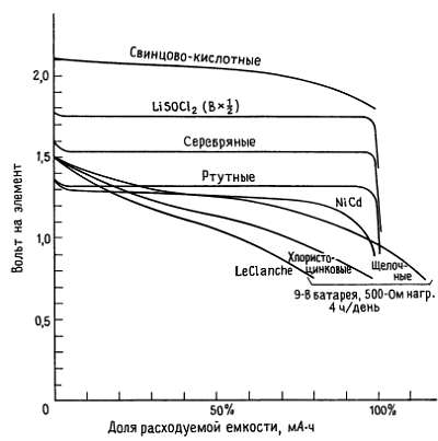 Предлагаемый перечень делится на так называемые гальванические элементы и аккумуляторы. Гальванические элементы спроектированы только для единственного цикла разряда, т. е. они неперезаряжаемые. Аккумуляторы (NiCd, свинцово-кислотные и гельного типа в вышеприведенном перечне) сконструированы так, чтобы быть подзаряжаемыми, в типовом случае от 200 до 1000 раз. Выбор гальванических элементов вы обычно делаете исходя из их химического состава и компромисса между такими параметрами, как цена, плотность энергии, долговечность при хранении, постоянство напряжения в течение разряда, производительность по пиковому току, температурный диапазон и популярность. Поскольку вы уже выбрали правильно батарею по химическому составу, то теперь надо вычислить какая батарея (или последовательное включение батарей) содержит достаточное количество энергии для вашего прибора.