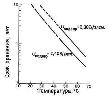 Рис. 14.6. Избыточное подзаряжающее напряжение уменьшает срок службы батарей свинцово-кислотных аккумуляторов.