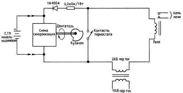 Релейные схемы. Те популярные «установленные сзади» термостаты, которые убавляют нагрев ночью и включают его снова за полчаса до вашего подъема, используют небольшую мощность переменного тока, которую можно отвести от релейной схемы без замыкания самого реле. Типовые механические реле управления потребляют ток в 100 мА или более при номинальном переменном напряжении на катушке 24 В и можно рассчитывать, что они останутся в разомкнутом состоянии при 10 % от этого нормального тока через катушку. Таким образом, вы можете получить 10 мА или около того при почти 24 В переменного напряжения для питания вашего прибора. Не забудьте включить подзаряжаемые элементы (или возможно конденсатор для сохранения содержимого памяти, если это все, что требуется), поскольку источник питания пропадает, когда замыкаются контакты подключения реле к источнику питания. На рис. 14.10 дана иллюстрация этой идеи.
