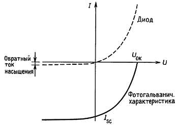 Рис. 14.12. Зависимость выходного напряжения солнечного элемента от тока нагрузки представляет собой просто перевернутую кривую U-I диода.