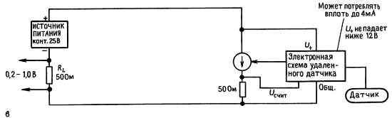 Постоянное смещение этого контура обычно обеспечивается на приемном конце (рис. 14.15, в). Существуют два стандарта, а именно полномасштабные диапазоны от 4 до 20 мА и от 10 до 50 мА. Стандарт 4-20 мА является более популярным и обычно использует постоянное смещение в 24 В (хотя иногда и выше). Для упрощения часто желательно использовать ток сигнализации для питания расположенных на удаленном конце электронных схем. С этой целью вы можете использовать напряжение смещения в контуре для организации системы питания.