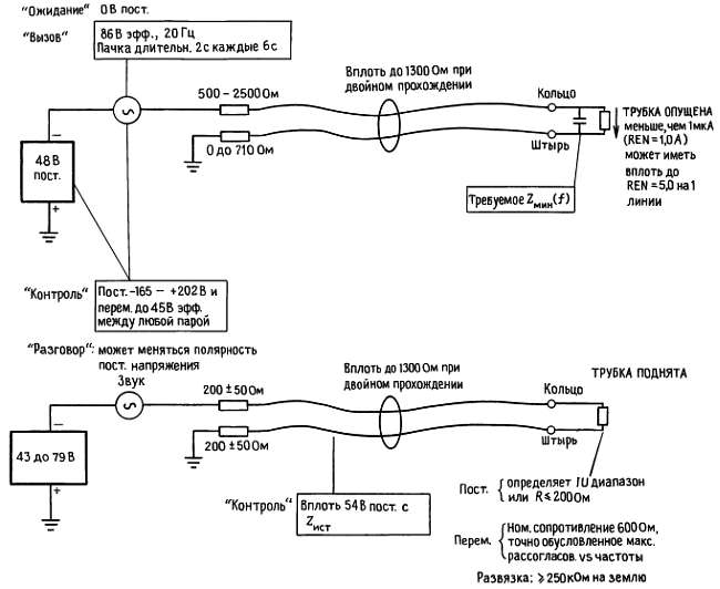 В незанятом состоянии линии центральная станция телефонной компании прикладывает —48 (±6) В постоянного напряжения, подаваемого через последовательный резистор с сопротивлением от 500 до 2500 Ом в контакт «кольцо», и нагружает линию через контакт «штырь» на землю через резистор с сопротивлением от 0 до 710 Ом. Кроме того, в типовом случае имеется вплоть до 1300 Ом внешнего линейного сопротивления между центральной телефонной станцией и вами («абонентом»). Когда вы поднимаете трубку, центральная телефонная станция переходит в режим набора номера, при этом вырабатывается тональный сигнал готовности, прикладывается постоянное напряжение от —43 до —79 В через последовательно включенный резистор 200 ±50 Ом к контакту «кольцо» и производится замыкание контакта «штырь» на землю через такое же полное сопротивление. Аналогичные постоянное напряжение и полные сопротивления источника присутствуют и в разговорном режиме (т. е после того, как соединение установлено), хотя телефонная компания может, и это их право, изменить полярность прикладываемого к контакту «кольцо» постоянного напряжения. Естественно, в режиме переговоров в линии также присутствуют накладываемые на это постоянное напряжение звуковые сигналы, передача которых и является основной задачей телефонии!