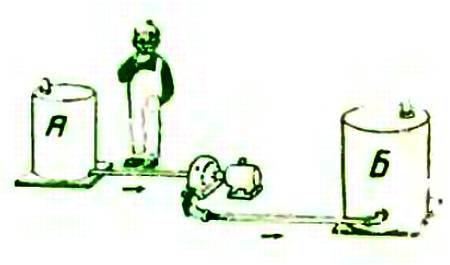 На рисунке изображена система трубопроводов для перекачки масла из бака А в бак Б насосом. Надо решить задачу: как дополнить эту систему (маслопроводами и запорными вентилями), чтобы, не меняя направления работы насоса, получить возможность перекачивать масло не только слева направо, но и справа налево (из бака Б в бак А).