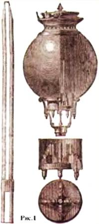Вначале посыпались искры, затем промежуток между угольками заполнило ослепительное пламя. По форме оно напоминало огненный дугообразный мост. Так был открыт электрический дуговой разряд — самый яркий на последующие сто с лишним лет источник света. Раньше всех дугу стали практически применять в России. В 1849 году академик Б.С.Якоби установил дуговой фонарь на башне Адмиралтейства в Петербурге (рис. 1).
