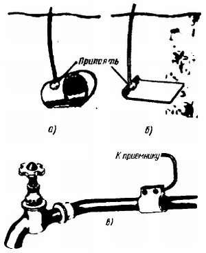 Если ты живешь в городе, то заземлением могут служить трубы водопровода, центрального парового или водяного отопления, так как они имеют хороший электрический контакт с землей. Трубу (по возможности ближе к твоему рабочему месту) надо осторожно зачистить до блеска напильником и туго обмотать этот участок трубы концом зачищенного медного провода, который пойдет к приемнику. Надежный контакт провода с трубой можно сделать и с помощью, металлического хомута (рис. 21, в).
