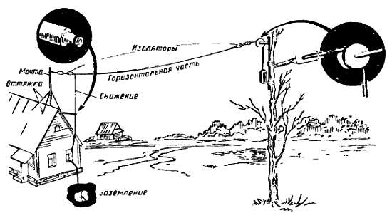 Такая антенна состоит из провода длиной 20–40 м, подвешенного с помощью опор — мачт на высоту 10–15 м над землей, и снижения — того же или такого же провода, свисающего вниз, конец которого подключают к радиоприемнику. Ту часть снижения, которую вводят в дом, называют вводом антенны. Чем длиннее горизонтальная часть антенны, и чем выше над землей она поднята, тем лучше радиоприем.