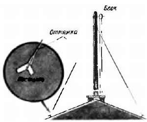 Если в качестве одной опоры антенны использовать дерево, то к его стволу нужно привязать шест с блоком на конце, как показано на рис. 22. Свободный конец троса, пропущенный через блок, к столу не крепи во время ветра качающееся дерево может оборвать провод антенны. К нему надо привязать какой-нибудь груз, например камень. Подбирая массу этого груза, легко добиться необходимого натяжения горизонтального луча антенны.