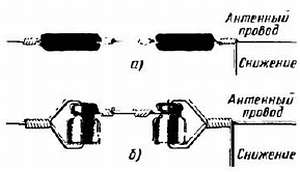 Зачем нужен грозопереключатель? Чтобы отводить в землю электрические заряды, возникающие в проводах наружной антенны под действием различных атмосферных явлений. Когда приемником не пользуются, антенна должна быть заземлена — нож грозопереключателя устанавливают в верхнее положение. Перед началом радиопередач нож грозопереключателя перекидывают вниз, переключая заземление на приемник. Если к радиопередаче начинают примешиваться значительные трески, являющиеся признаком приближения грозы (в это время заряды из антенны уходят в землю через искровой промежуток), радиоприем желательно прекратить, а антенну заземлить. При этом приемник перестает работать, а создающиеся в антенне электрические заряды через нож переключателя стекают в землю, не причиняя вреда ни приемнику, ни слушателю.