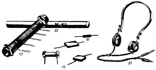 Рис. 28. Самодельная катушка индуктивности (а), ферритовый стержень (б), точечный диод (в), конденсаторы (г) и головные телефоны (д), необходимые для опытного приемника