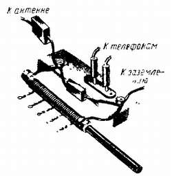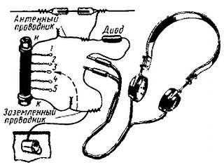 Теперь займись настройкой приемника путем присоединения заземленного проводника сначала к отводу 5, затем к отводу 4 и так до отвода 1. Одновременно следи, чтобы отводы катушки и соединительные проводники не соприкасались, а контакты в скрутках не нарушались. Иначе приемник совсем не будет работать или в телефонах будут слышны трески, шорохи, мешающие приему. Электрические контакты будут надежнее, если места соединений проводников и деталей пропаять.