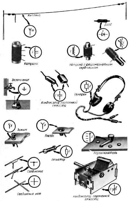 На рис. 33 ты видишь уже знакомые тебе детали и устройства и некоторые другие, с которыми придется иметь дело в дальнейшем. А рядом в кружках — их символические графические изображения на принципиальных схемах. Любую катушку индуктивности без сердечника, независимо от ее конструкции и числа витков, на принципиальной схеме изображают в виде волнистой линии. Отводы катушек показывают черточками. Если катушка имеет неподвижный ферромагнитный сердечник (ферритовый стержень), увеличивающий ее индуктивность, его обозначают прямой линией вдоль изображения катушки. Если таким сердечником настраивают контур приемника, как это было в опытном приемнике, его на схеме обозначают то же прямой, но вместе с катушкой пересекают стрелкой. Подстроенный ферромагнитный сердечник катушки обозначают короткой жирной чертой, пересекающейся Т-образным символом.