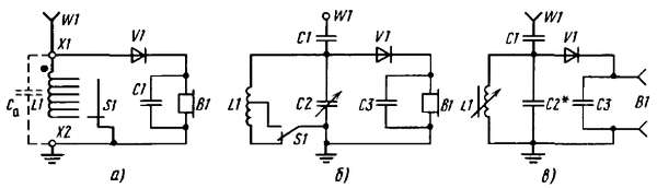 Рис. 34. Принципиальные схемы вариантов опытного приемника с настройкой переключением отводов катушки (а), конденсатором переменной емкости (б), ферритовым стержнем (в)
