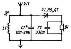 Диод V1, выполняющий функцию детектора, может быть любым из серий Д2, Д9. Емкость конденсатора С1, блокирующего телефоны В1, может быть от 2200 до 6800 пФ. Переключатель S1 самодельный ползункового типа (см. девятую беседу).
