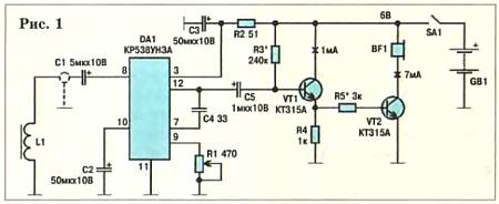 Добавив к микросхеме совсем немного, получим «адаптер» для бесконтактного съема звуковых сигналов и их воспроизведения миниатюрным низкоомным телефоном (рис. 1).
