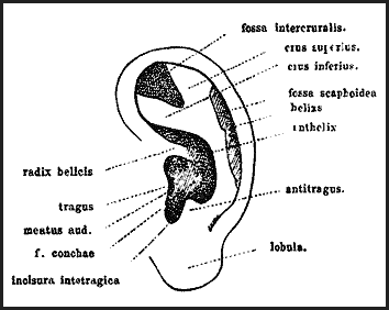 Как известно, в ушной раковине различают выпуклые части и углубления. Выпуклые следующие: завиток (helicis) с его корнем (radix helicis); от последнего кзади иногда продолжается в горизонтальном направлении гребешок завитка — crista helicis; затем — противузавиток (antihelicis), который по направлению к верху разделяется на 2 ножки, — crura anthelicis (superius et inferius); наконец, 2 бугорка — tragus и antitragus. Углубления ушной раковины следующие: fossa conchae, fossa scaphoidea и fossa intercruralis. Нижняя мягкая часть уха называется мочкой, или сережкой, уха — lobula. Выемка между tragus и antitragus называется incisura intertragica.