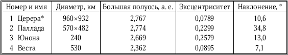 А что же Церера? Стала ли она полноправным членом нашей планетной системы? Думаю, если бы других тел в промежутке между Марсом и Юпитером не нашлось, астрономы смирились бы с малым размером Цереры и стали бы называть ее планетой. Однако дело приняло неожиданный оборот. Тот самый врач-астроном Ольберс, который вторично открыл Цереру, через несколько месяцев, в марте 1802 г., обнаружил еще одно небесное тело, названное Палладой. Оно оказалась приблизительно такого же блеска и почти на таком же расстоянии от Солнца, что и Церера. В 1804 г. немецкий астроном Карл Людвиг Хардинг (1765–1834) открыл третий астероид – Юнону. А в 1807 г. Ольберс нашел еще один астероид – Весту. Характеристики этих тел приведены в табл. 4.2.