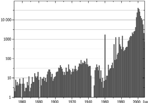Рис. 4.9. Количество астероидов с точно определенными орбитами, открытых в разные годы. Спад после 2000 г. объясняется тем, что для точного определения орбиты требуется несколько лет наблюдений.