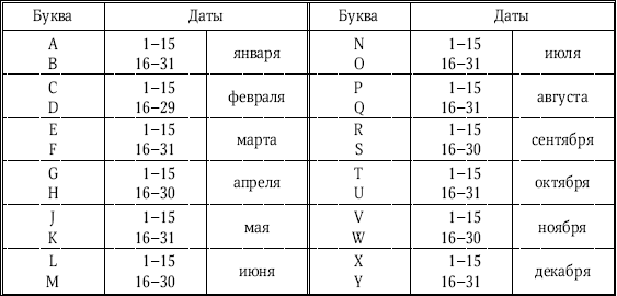 В эпоху массового открытия астероидов астрономам пришлось изобретать новую систему для их обозначения. Уже никто не мечтает придумать каждому астероиду личное имя. Тем малым планетам, орбиты которых надежно вычислены, дают порядковый номер (иногда позже предлагают и имя). А чтобы не запутаться среди объектов, открытых недавно и находящихся в процессе изучения, введена следующая система обозначений. Если объект наблюдается по крайней мере в течение двух ночей и не может быть отождествлен с уже известными объектами, ему присваивается предварительное обозначение, состоящее из следующих символов: год открытия + буква, обозначающая полумесяц этого года + буква, обозначающая номер открытия в этом полумесяце + число, обозначающее количество повторений всего алфавита в данном полумесяце. Все месяцы текущего года разбиты на полумесяцы, которым приведены в соответствие 24 буквы латинского алфавита, исключая буквы I и Z (табл. 4.5).