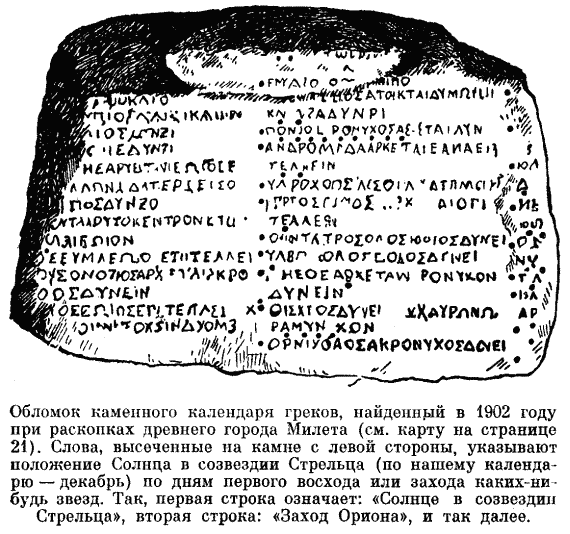 Двенадцать таблиц Метонова календаря и давали «звездное расписание» — последовательный порядок восходов и заходов наиболее известных звезд и созвездий. В сущности, это был своеобразный солнечный календарь, который указывал, какие знаки (созвездия) зодиака последовательно проходит Солнце в течение года. Но греки жили не по солнечному, а по лунному календарю. Для согласования этого календаря с движением Солнца в каждой таблице и было просверлено тридцать отверстий — по числу дней в месяце.