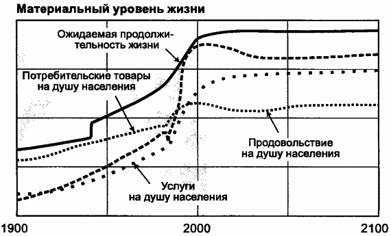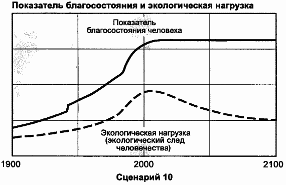 Населению в Сценарии 10 удается без проблем поддерживать высокий уровень жизни и обеспечивать технологический прогресс. Это общество наслаждается более благоприятной окружающей средой, располагает большим количеством ресурсов, имеет больше степеней свободы. Оно не подходит так близко к пределам допустимого и не балансирует на краю, как общество из Сценария 9. Такое будущее было вполне возможным. Однако в 1982 г. мир этой возможностью не воспользовался.