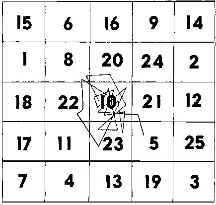 У здорового и отдохнувшего человека на каждую таблицу уходит примерно одинаковое время. Увеличение времени на отыскание чисел в последних таблицах говорит о том, что человек несколько утомился. По мере тренировок скорость нахождения чисел постепенно возрастает благодаря развитию периферического зрения. Интересно проследить характер изменений движения глаз при работе с таблицами. На рис. 26 показана запись движения глаз человека, не имеющего инструкции о правилах работы с таблицами. Общее время поиска всех цифр — 60 сек. Как показано на рисунке, взгляд последовательным перебором переходит от цифры к цифре. Такая тренировка практически ничего не дает для развития периферического поля зрения.