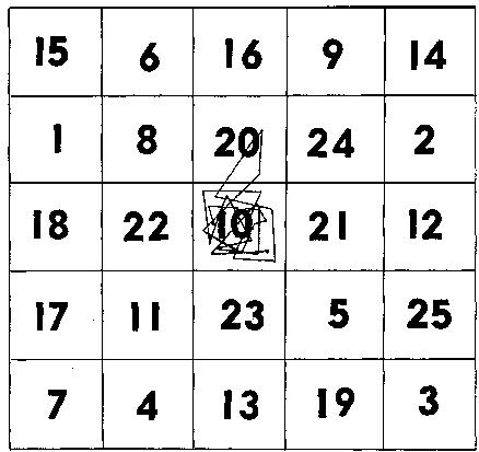 Нам удалось найти специальный методический инструмент и разработать упражнения, которые значительно расширяют поле ясного видения и решают задачу вертикального движения глаз по центру страницы при чтении. Таким инструментом оказались широко известные у психологов тестовые цифровые таблицы Шульте. На вкладыше, приложенном к книге, размещено 8 таблиц Шульте. При работе с ними надо, концентрируя взгляд в центре очередной таблицы, видеть ее всю целиком и найти все видимые цифры по порядку нарастания счета за время не более 25 сек. Таблицы Шульте обычно применяются для исследования и развития психического темпа восприятия, в частности скорости зрительных ориентировочно-поисковых движений. Каждая таблица представляет собой разграфленный на 25 ячеек квадрат размером 20Х20 см со вписанными в ячейки в беспорядке числами от 1 до 25. Вам необходимо использовать все 8 таблиц или изготовить их самим по образцу (рис. 26). Время, затраченное на поиск всего ряда чисел в каждой таблице, замеряется по секундомеру.